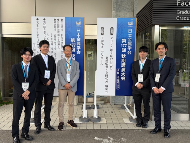 2025年9月16~18日 北海道大学で開催された日本金属学会 2025年秋期(第177回)講演大会に多根先生、M2浅井君、坂部君、森田君およびM1の峰元君が参加し、下記の発表を行いました。