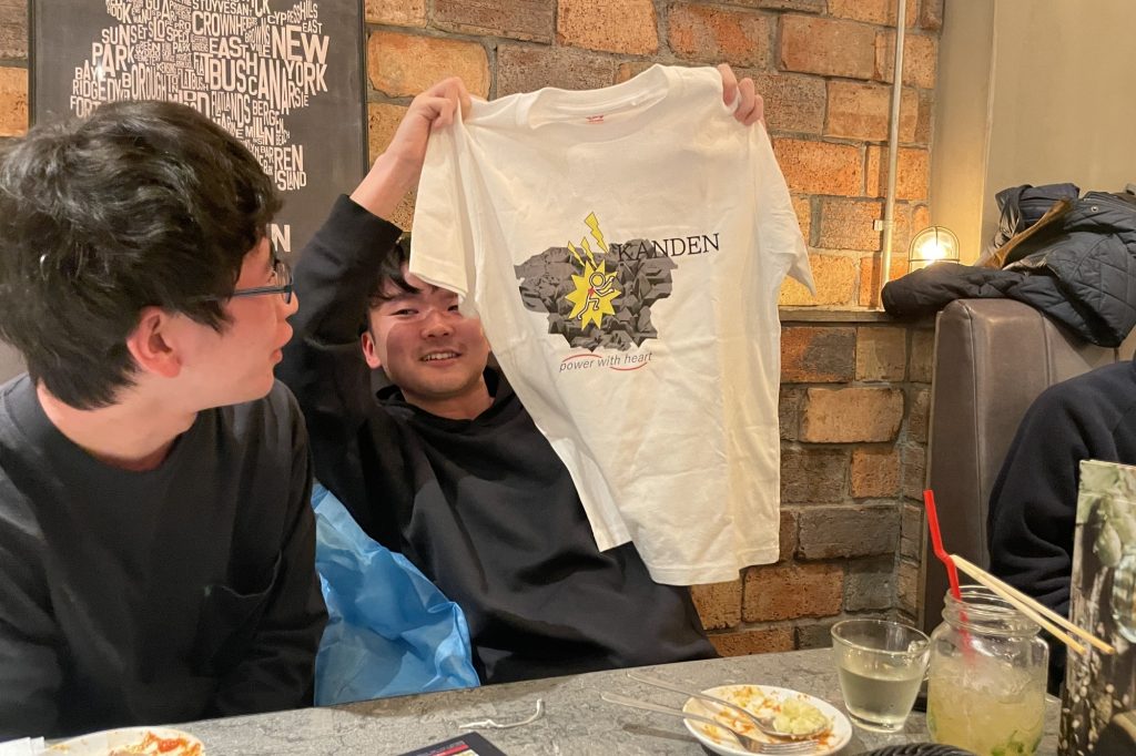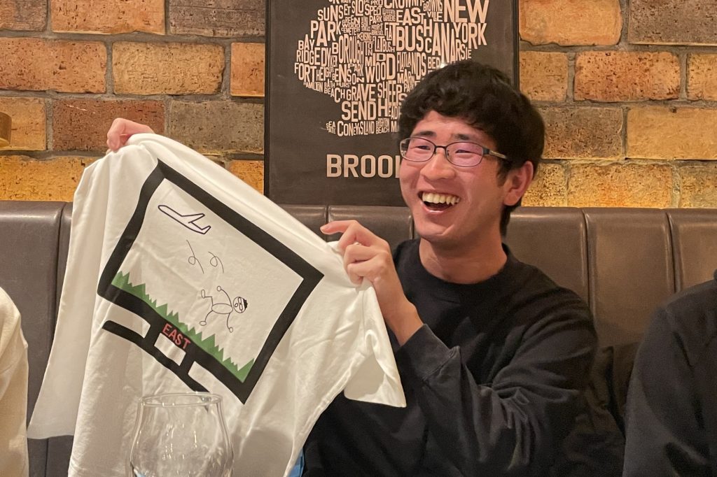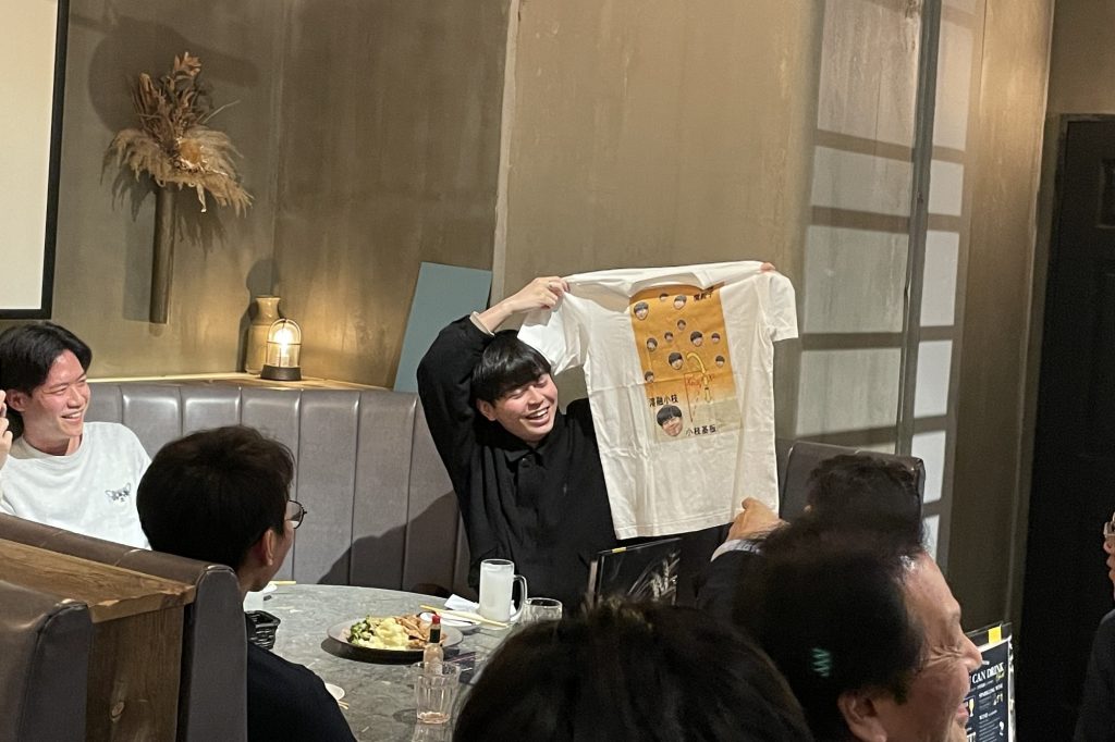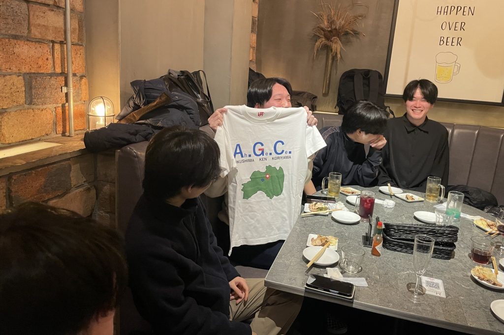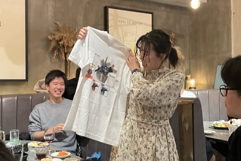 送別の品として、M1メンバーが卒業生それぞれの研究内容や就職先にちなんだオリジナルTシャツを準備し、M2の学生たちも大変喜んでいました!
