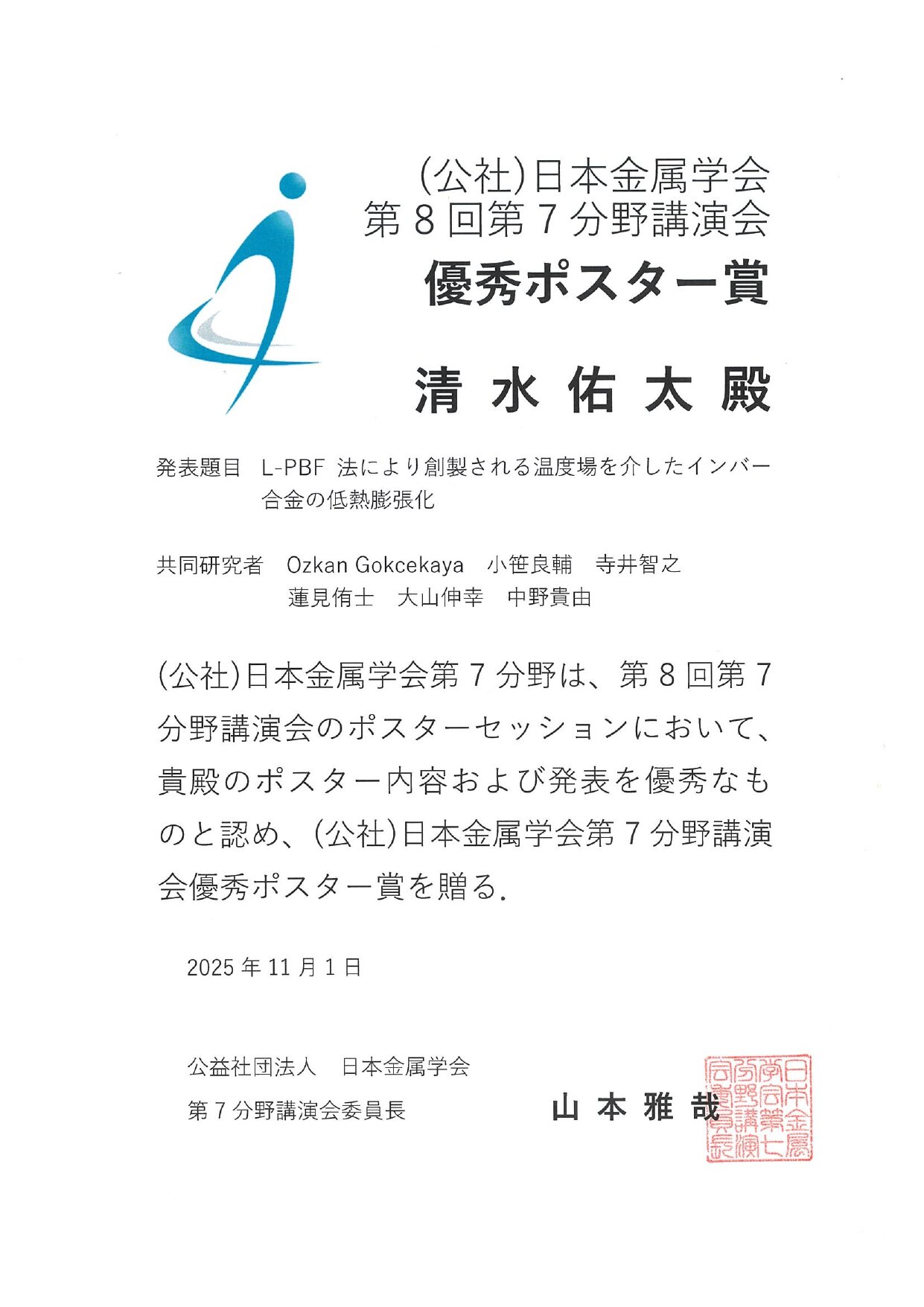 ○清水佑太、Ozkan Gokcekaya、小笹良輔、寺井智之、蓮見侑士、中野貴由: L-PBF法により創出される温度場を介したインバー合金の低熱膨張化, 第8回日本金属学会第7分野講演会優秀ポスター賞、2025年11月1日