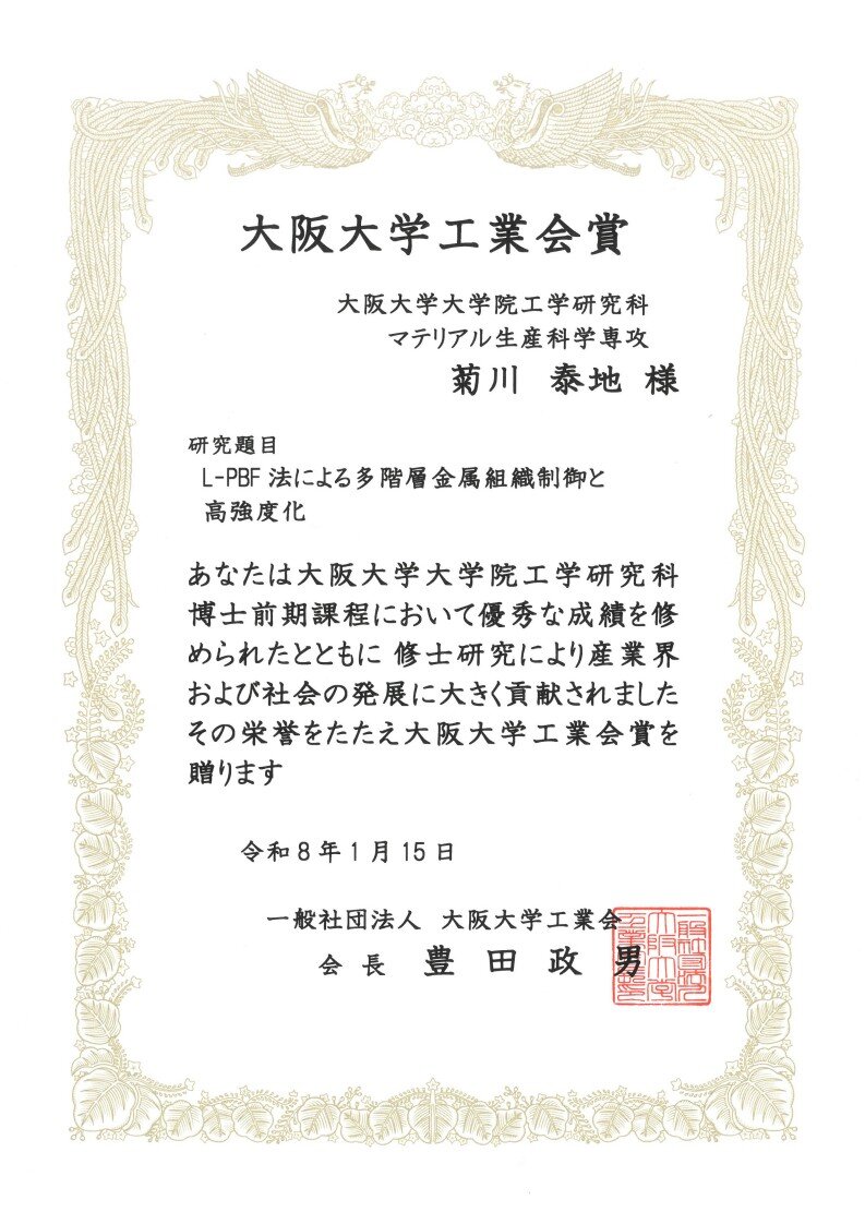 ○菊川泰地: L-PBF法による多階層金属組織制御と高強度化, 大阪大学工業会賞、一般社団法人 大阪大学工学会、2026年1月15日