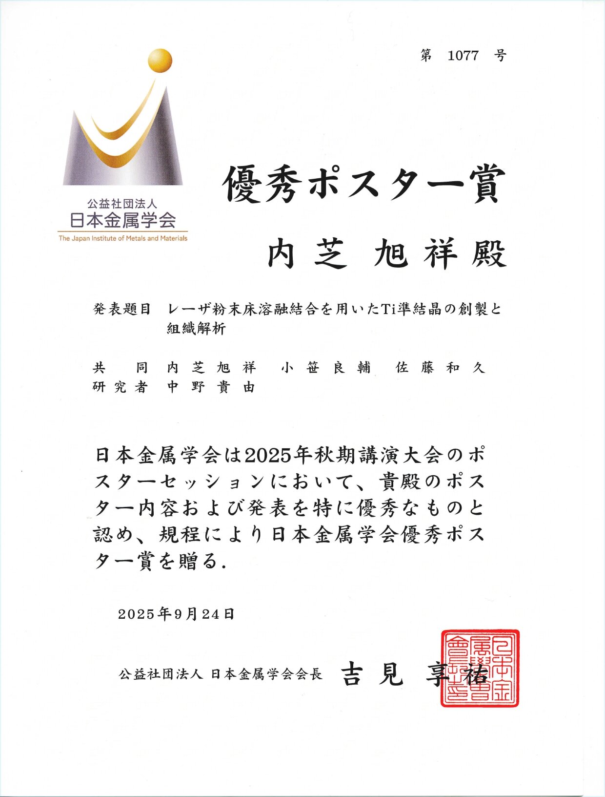 内芝旭祥、小笹良輔、佐藤和久、中野貴由: レーザ粉末床溶融結合を用いたTi準結晶の創製と組織解析、 日本金属学会2025年秋期講演⼤会第45回優秀ポスター賞、北海道大学、2025年9月24日