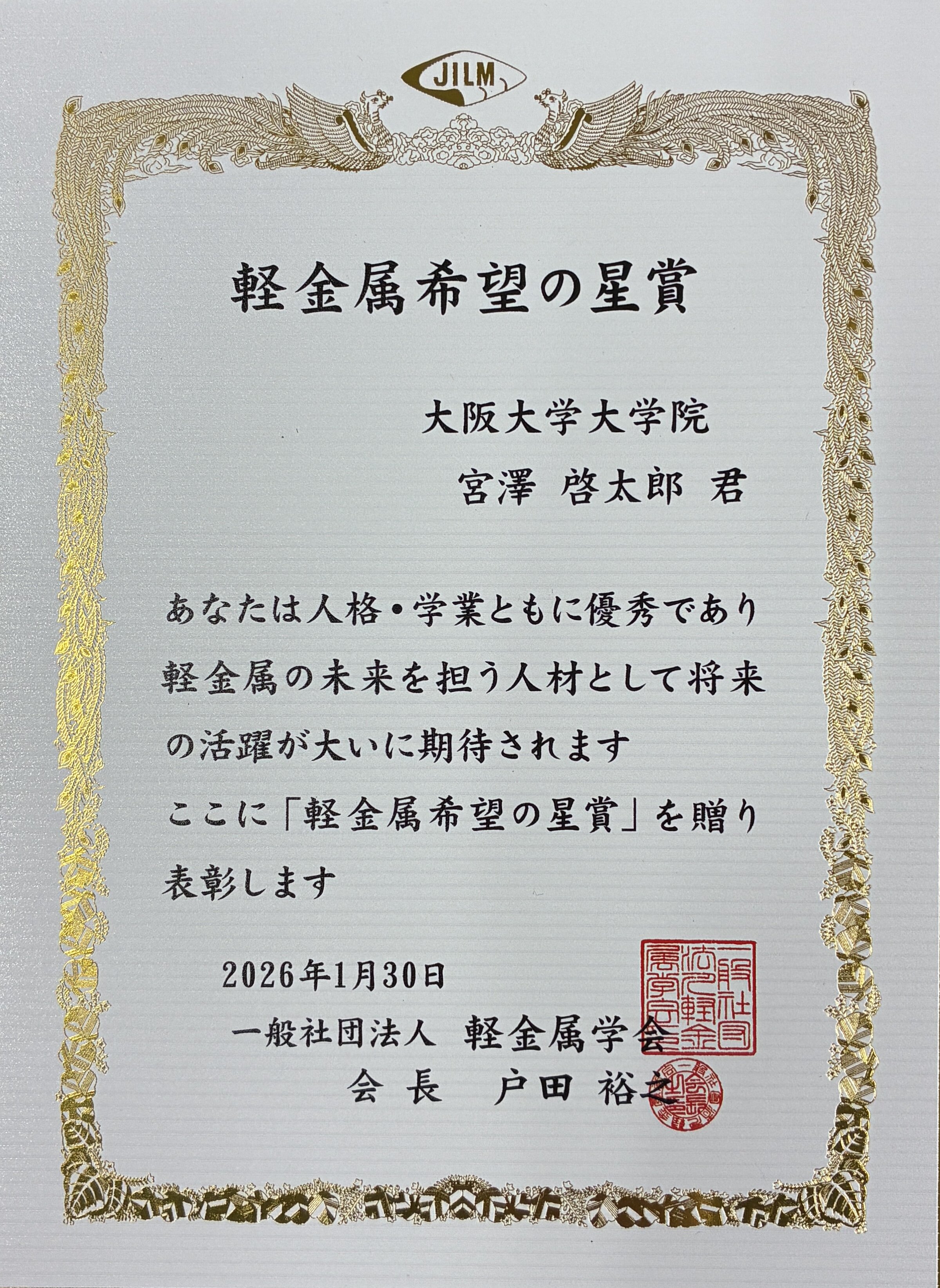 ○宮澤啓太郎: 軽金属希望の星賞、一般社団法人 軽金属学会、2026年1月30日