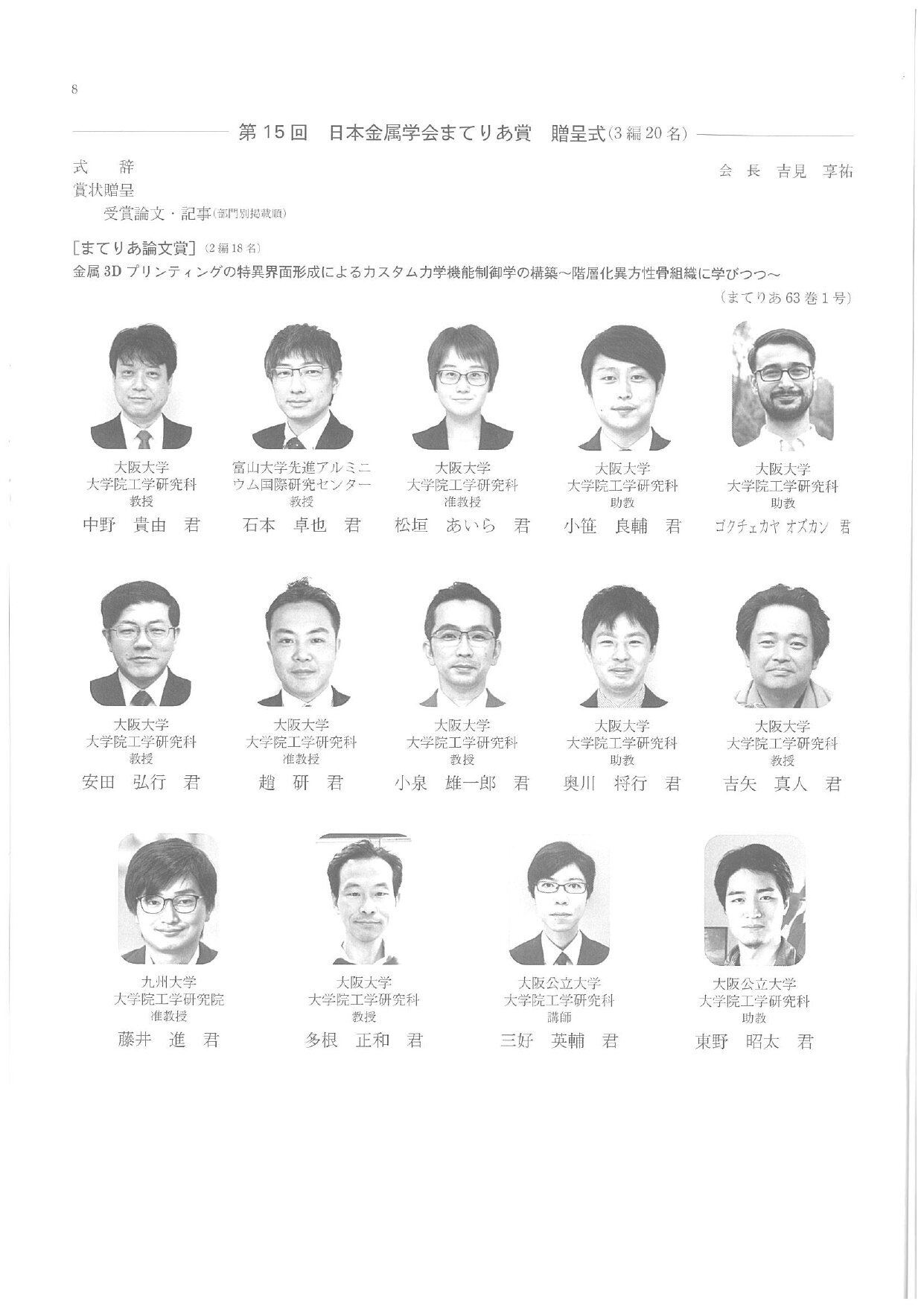 中野貴由、石本卓也、松垣あいら、小笹良輔、ゴクチェカヤ オズカン、安田弘行、趙研、小泉雄一郎、奥川将行、吉矢真人、藤井進吾、多根正和、三好英輔、東野昭太: 金属3Dプリンティングの特異界面形成によるカスタム力学機能制御学の構築~階層化異方性骨組織に学びつつ~、 第15回 日本金属学会まてりあ賞、2025年9月17日