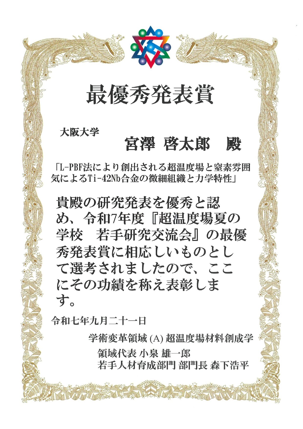 ○宮澤啓太郎、小笹良輔、中野貴由: L-PBF法により創出される超温度場と窒素雰囲気によるTi-Nb合金の微細組織と力学特性, 超温度場夏の学校 若手交流研究会 最優秀発表賞、2025年9月21日