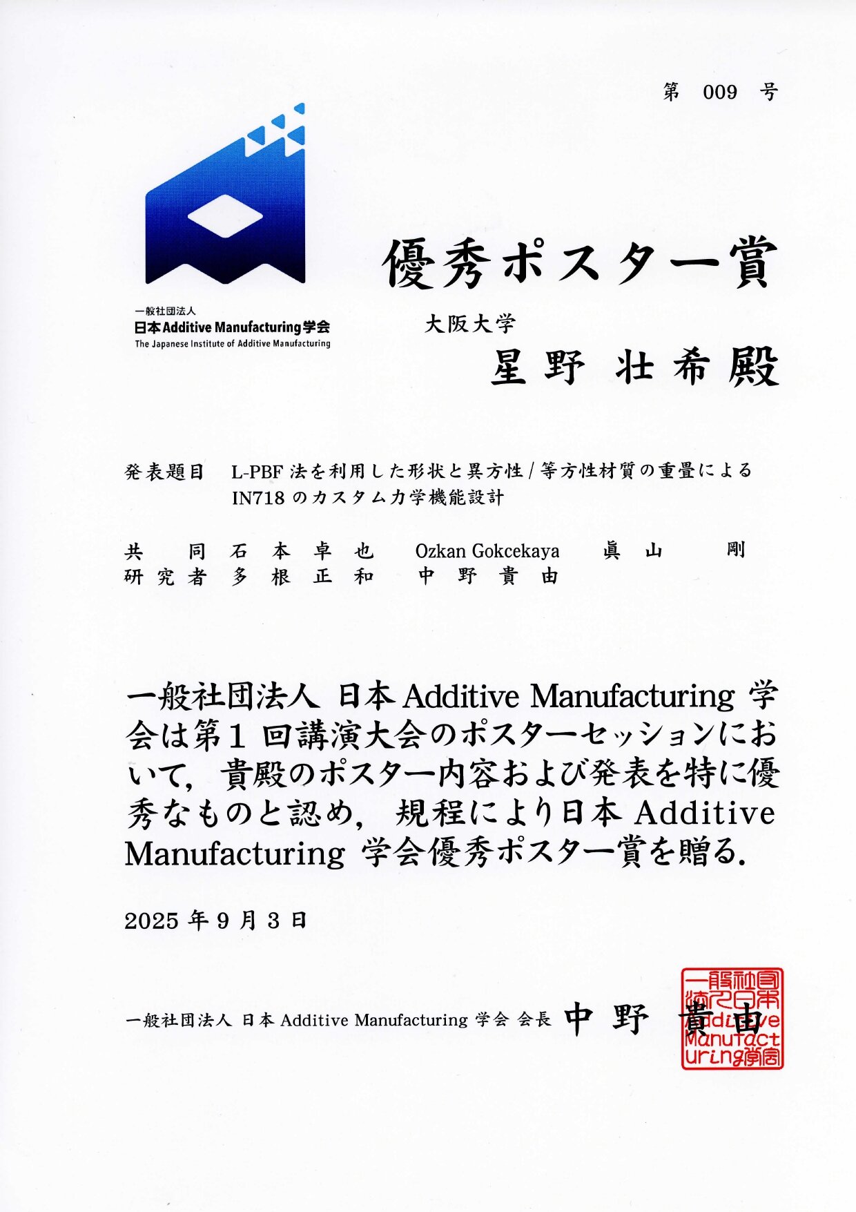 ○星野壮希、石本卓也、Ozkan Gokcekaya、眞山剛、多根正和、中野貴由: L-PBF法を活用した形状と異方性 / 等方性材質の頂上によるIN718のカスタム力学機能設計, 日本AM学会第1回講演大会優秀ポスター賞、東京都立産業貿易センター浜松町館、2025年9月3日